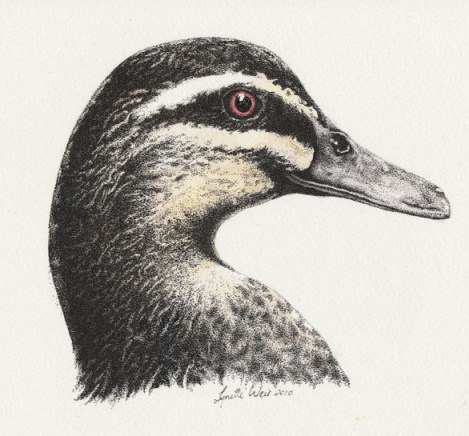 The drawing is done with a fine rotring 0.5 pen with a light underlay of watercolour to pick up some of the colour of the duck.