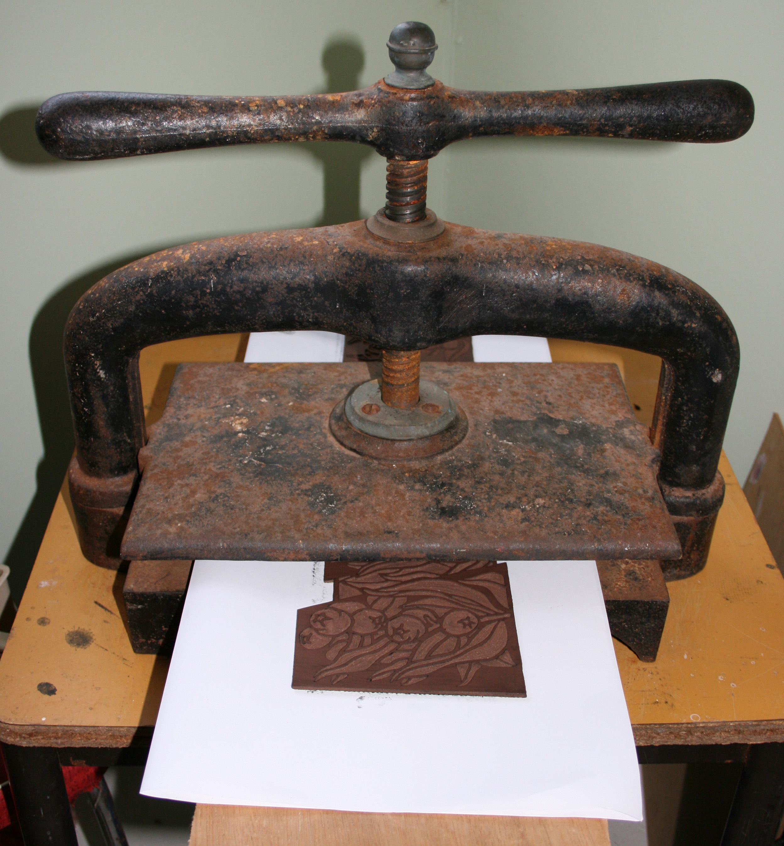 It is also where obviously my small bookpress is for printing. With its own designated steel legged table as it is although small, very heavy.