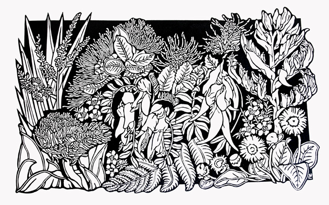 This is an image of the first print off the block. The next step is waiting for it to dry and then handcolouring. I use an oil based ink to print the black which can take a few days to dry depending on the weather. I then do a sample handcoloured print working out exact colours – within the designing process I had already made the major decisions about the general colours I would use so it is a refining process at this stage. I usually mark on this ‘master’ the names and sample of all the colours I use for each flower/foliage.