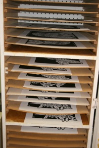 So, as I spent the day in the studio printing several linoblocks, I decided to post about printing linocuts or a carved linoblock. This is my print drying cupboard with some printings on the shelves drying.