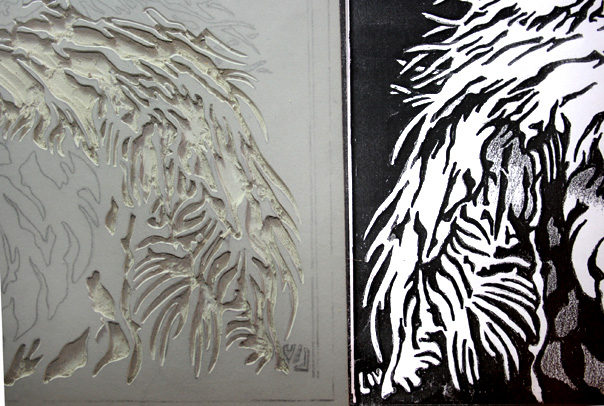 I will just show you a section of the linoblock I am carving with the section of the design I am working from.