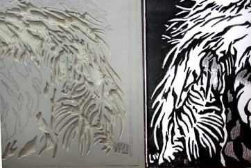 As is my usual way of working I have drawn the image/design I want to work on and then developed that into a ‘carvable image’ by colouring it as a B&W design (on the right).
