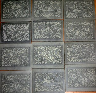 If you look at the edges around the carved designs you will see I haven’t as yet trimmed the blocks back. A good tip for carving is to leave a small edge that can be cut back with a knife when you have finished carving. As linoleum is a softer material it is easy to chip off an edge or even wear a corner off whilst carving. So if what you are looking for in a design is a nice even neat edge (well as best you can get given the pliable nature of the lino) then it is a good idea to leave a little around the edge of the design to cut back just before printing.