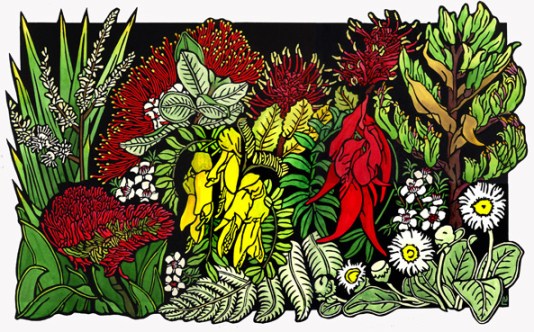 The final handcoloured print resulting from the above linoblock – New Zealand Wildflowers completed in 2008.