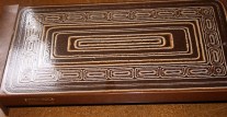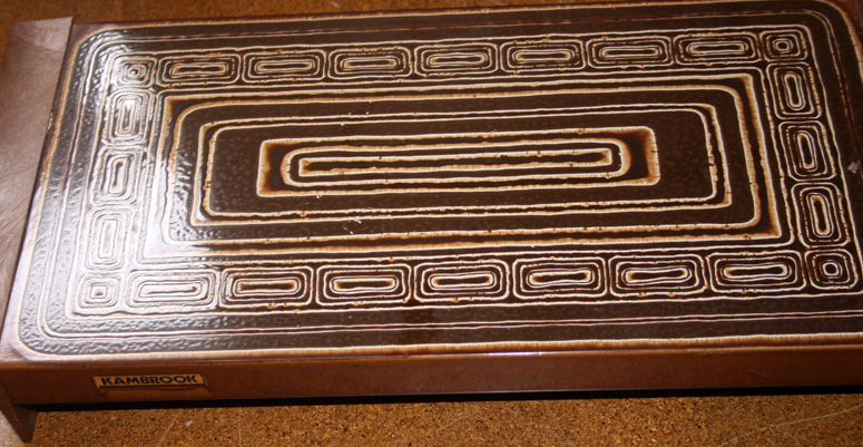 I have two – both of which belonged to my mother-in-law – she LOVED having large numbers of family and friends over with tables full of food. I actually don’t think these food warmers were used much as they seem brand new. I can also remember the warmers that had candles underneath. You can tell they are from the 1970′s by the ‘mission brown’ colour scheme and patternwork – the other one is that delightful 1970′s ‘orange tones’. They are however great because I set them up next to me and lightly warm the lino which makes it easier to carve. So for all you ‘lino-carvers’ out there – the next time you visit a garage sale or op shop check to see if they have one – they work exceptionally well.