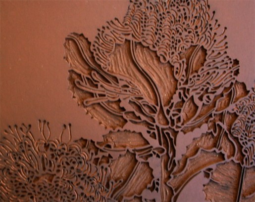 This closeup shows where I have come back to the linocut block and re-carved sections making the lines a bit deeper and less prone to filling with ink. If you look closely you will see some carved sections have the ink stain and others look ‘cleaner’ – these are the re-carved stamens.