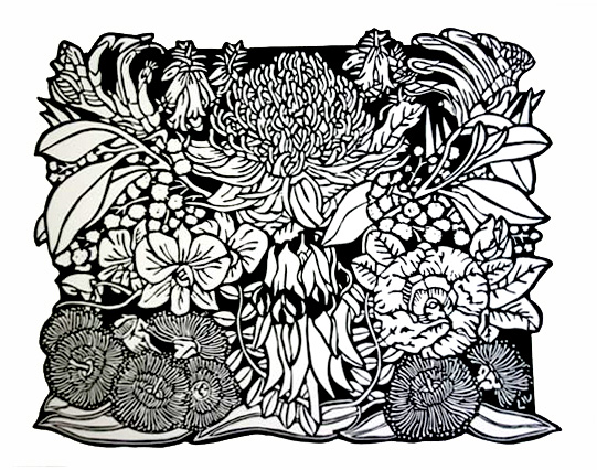 Unfortunately the first image on the isthe proof print for the linoblock I have just finished carving and the second image is a new template including the missing Royal Bluebells.