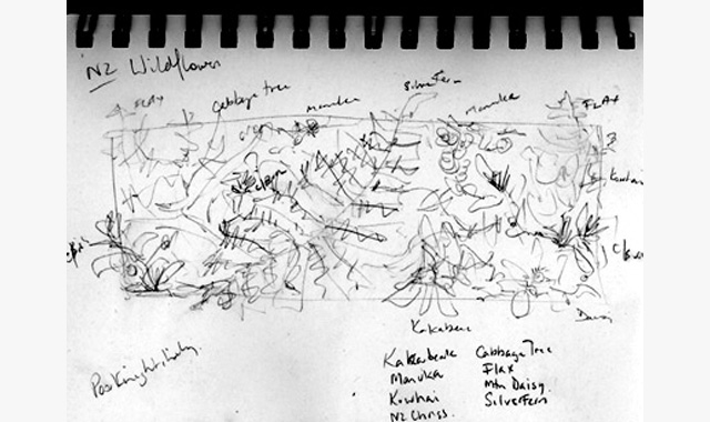 I then set about translating these ideas into a design – as with in the case of the NZ Wildflower design – I look at a selection of possible wildflowers/plants I could use and lightly sketch these up into the basic format/design layout. I then make a detailed drawing of the design. In this process the overall design layout and which wildflowers/plants I end up using may completely change or change position. I’ll assess not only what I consider the importance of each flower/foliage within the overall design concept but also their individual shape, size and colour and their effects on the overall design.