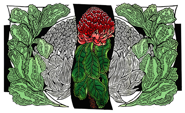 Above is the final finished carving of the “Regenerations – Waratahs” linoblock. It has been a slow progress – for example it took a full day to finish the central panel leaves. To give you an idea of the size of the block , the final printed image is 51cm x 30cm. The image on the right of the linoblock above shows the template image – note that it is a mirror image of the block – it is important to remember that when the image is printed it will print in reverse to the carved linoblock.